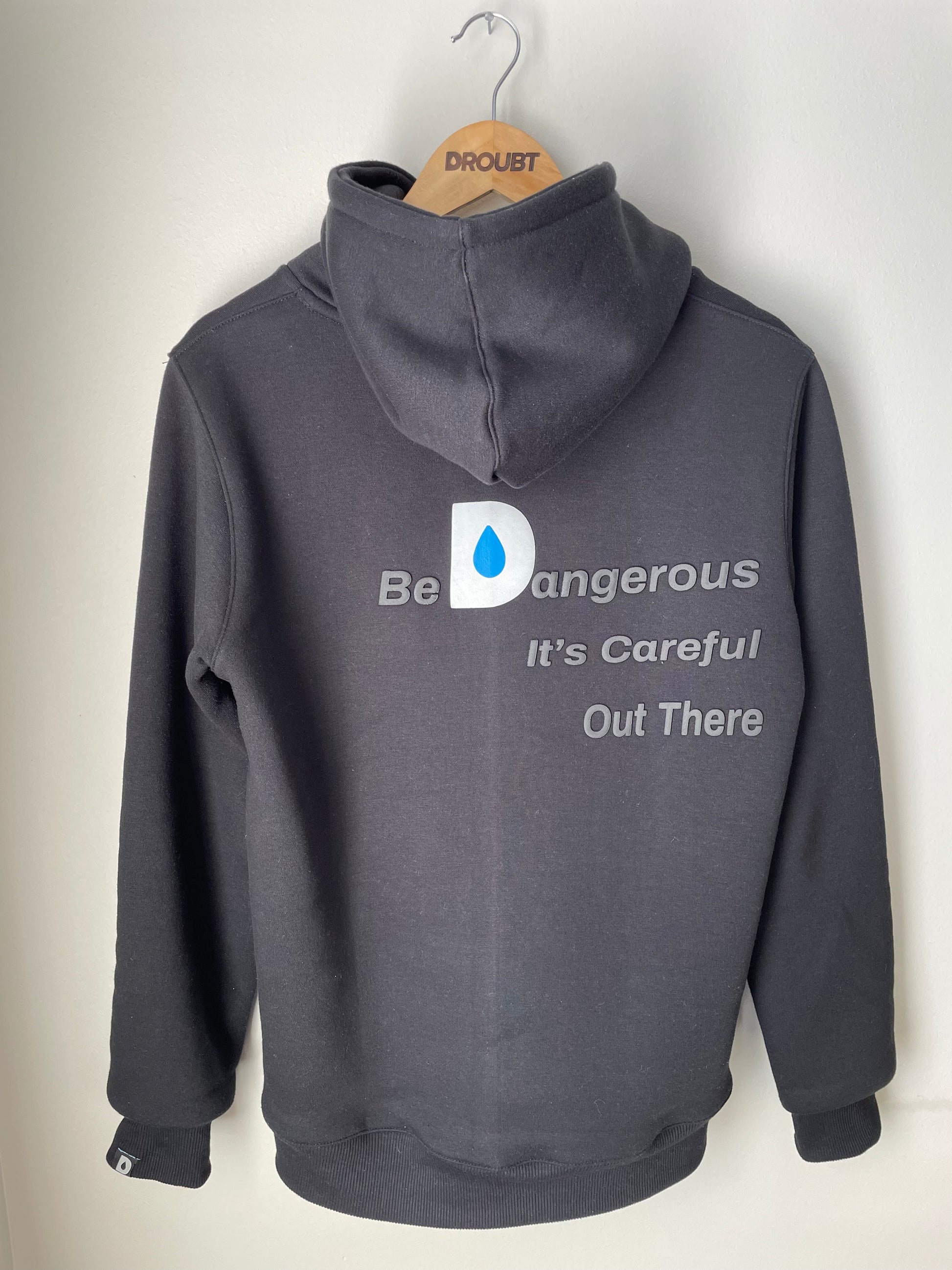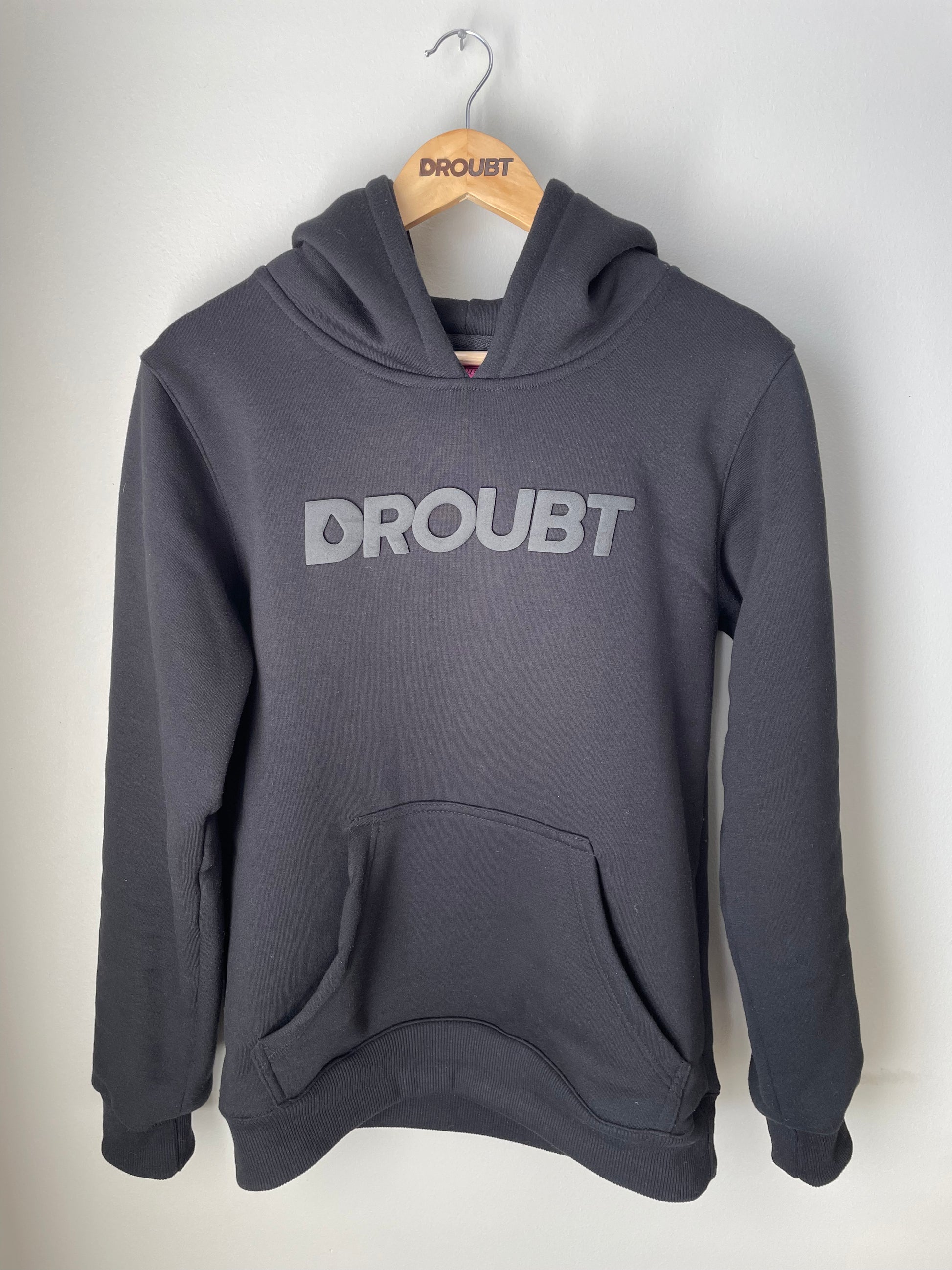 Droubt Signature Hoodie in Black. Droubt Logo in puff-print center chest. Logo and hoodie color tones match so you can wear it anytime & anywhere. Full color Droubt 'D' between shoulders on reverse side with the brand tag line, right justified. Stitched hem tag on left sleeve featuring Droubt "D" logo with slogan on the reverse side. Unisex. Fitted fit. Size up for a standard fit.