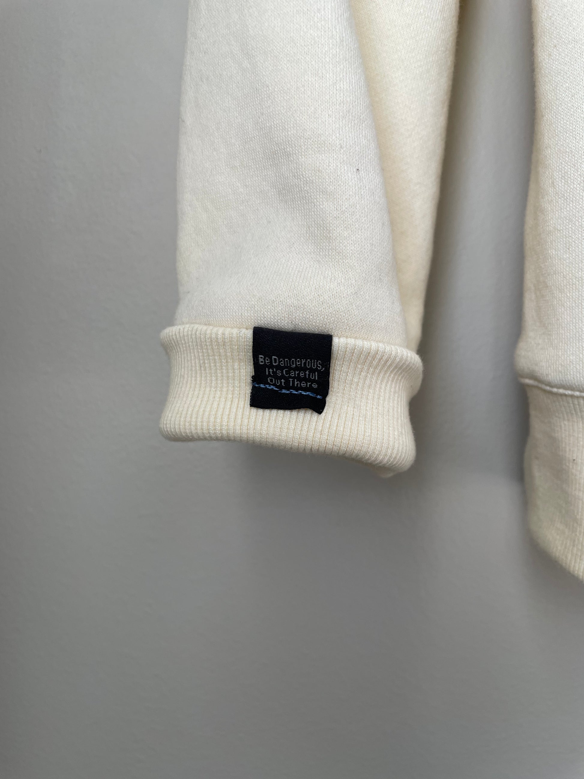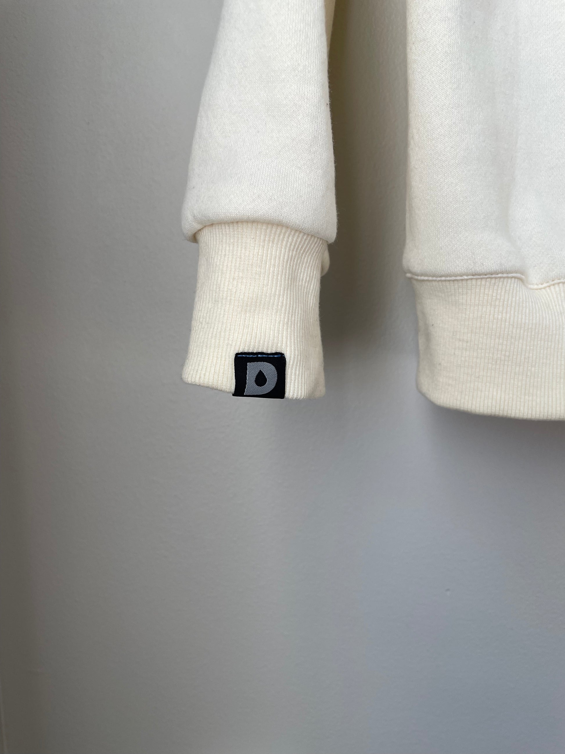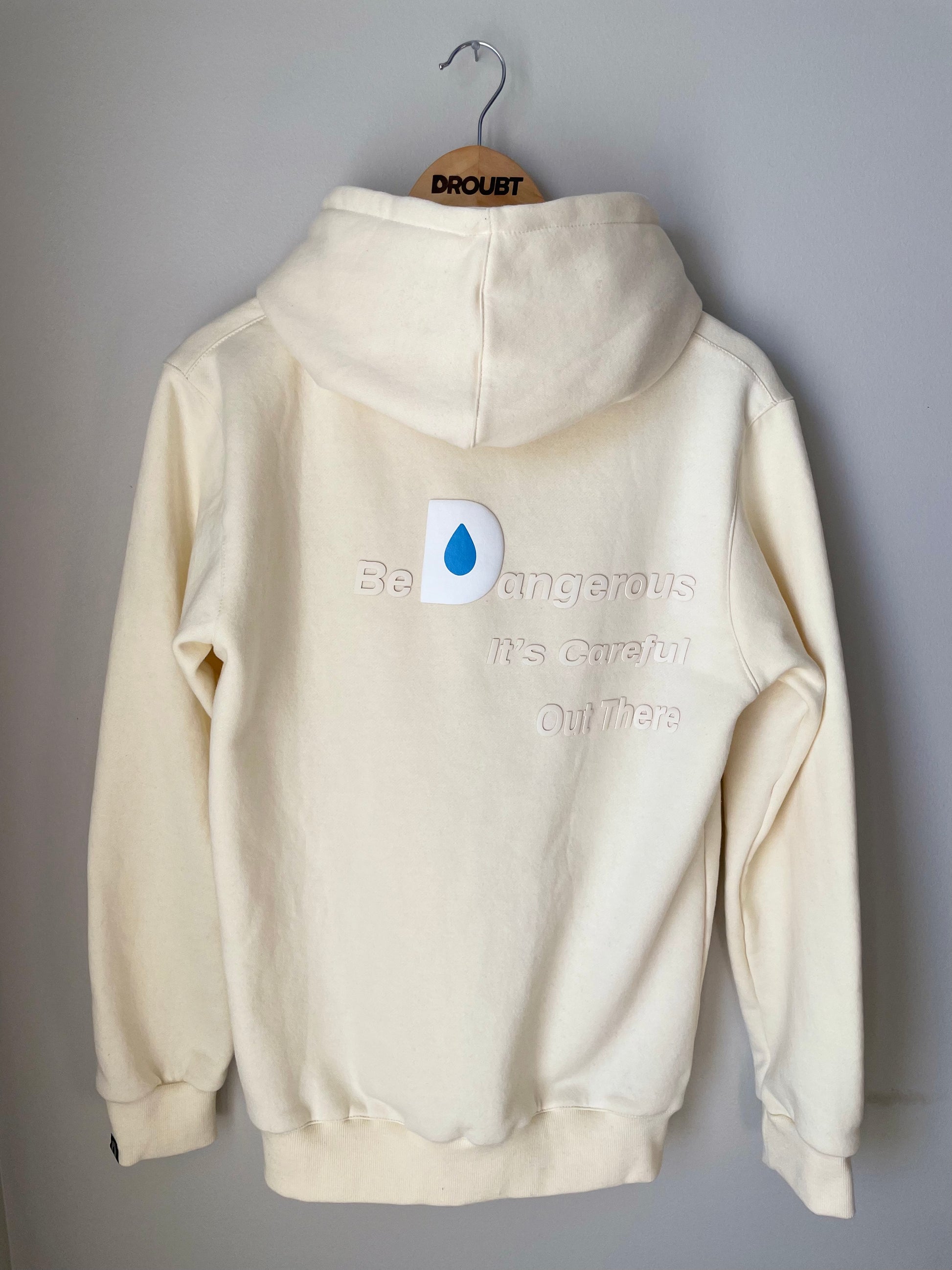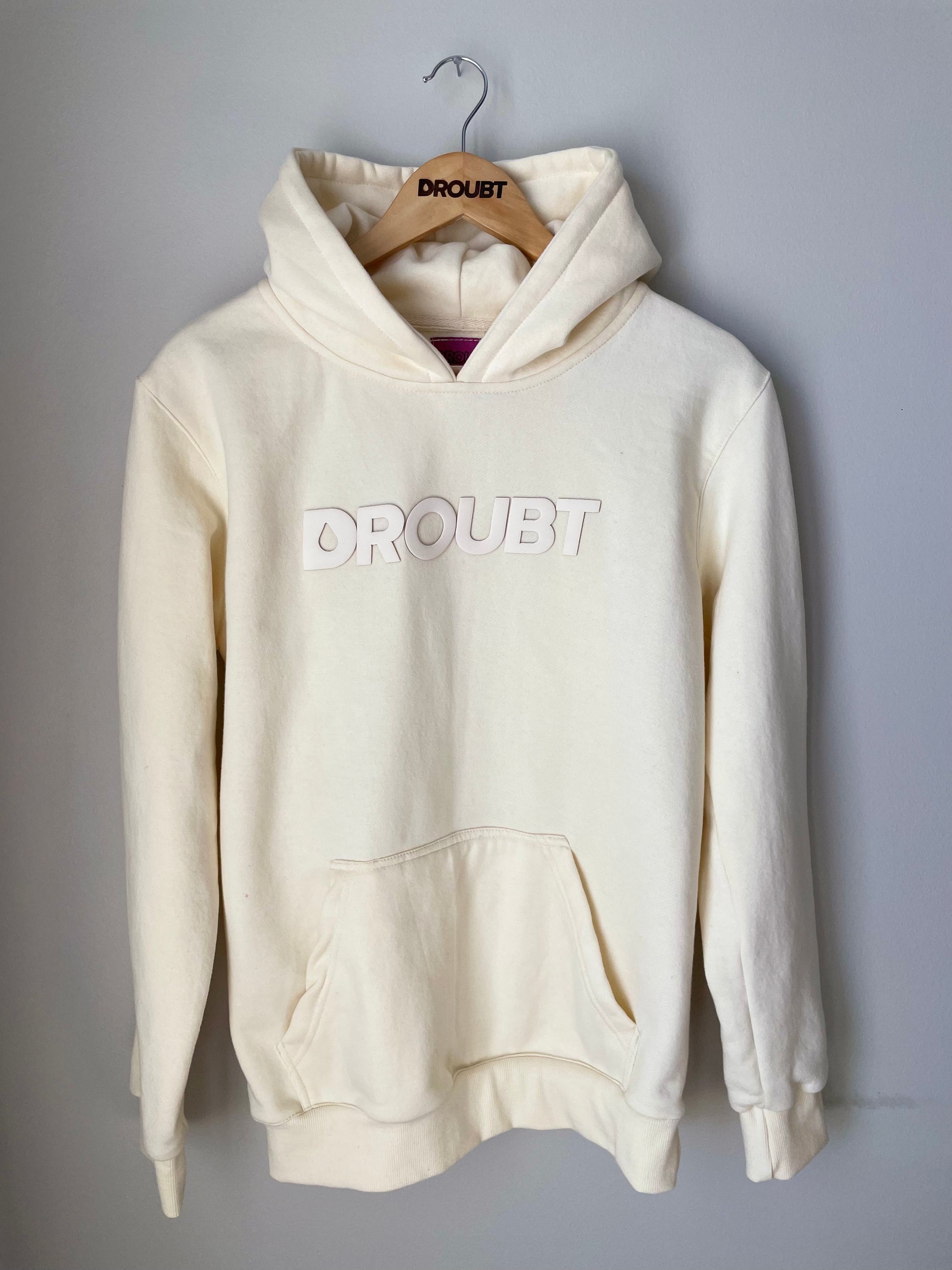 Droubt Signature Hoodie in Cream. Droubt Logo in puff-print center chest. Logo and hoodie color tones match so you can wear it anytime & anywhere. Full color Droubt 'D' between shoulders on reverse side with the brand tag line, right justified. Stitched hem tag on left sleeve featuring Droubt "D" logo with slogan on the reverse side. Unisex. Fitted fit. Size up for a standard fit.