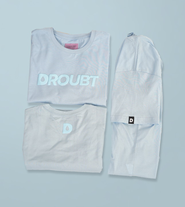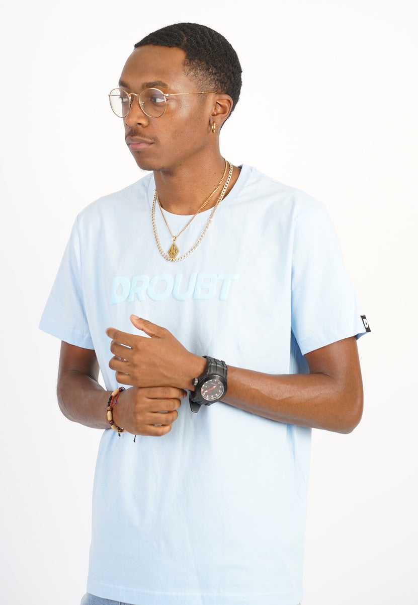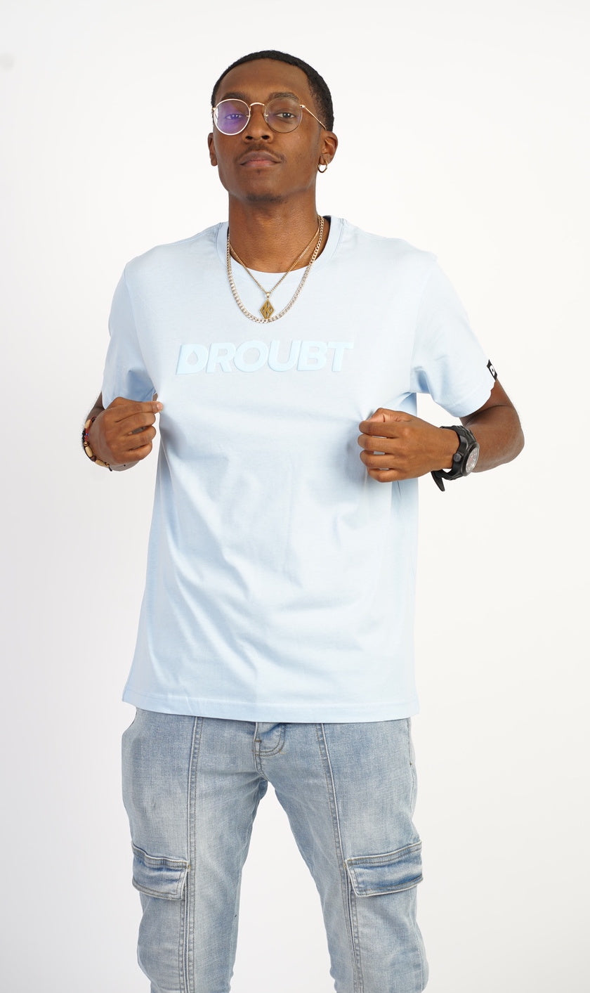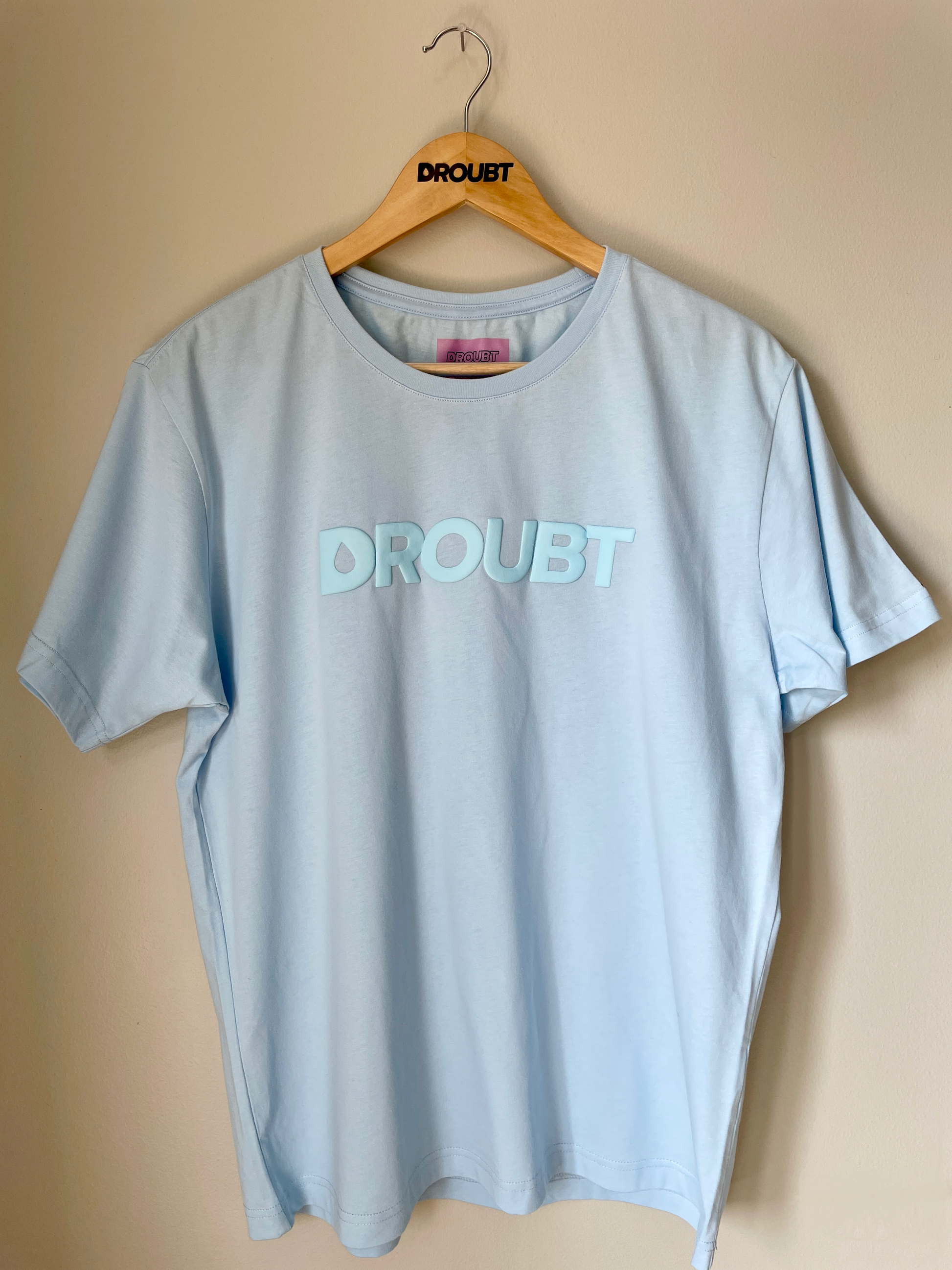 Droubt Signature Tee in Droubt Blue. Droubt Logo in puff-print center chest and between shoulders. Logo and shirt color tones match so you can wear it anytime & anywhere. Unisex. Fitted fit. Size up for a standard fit.