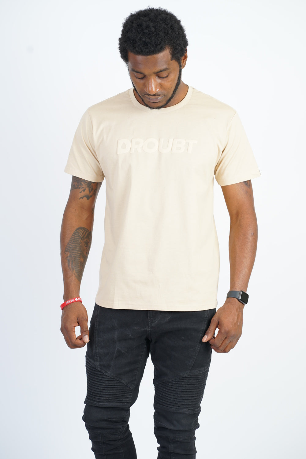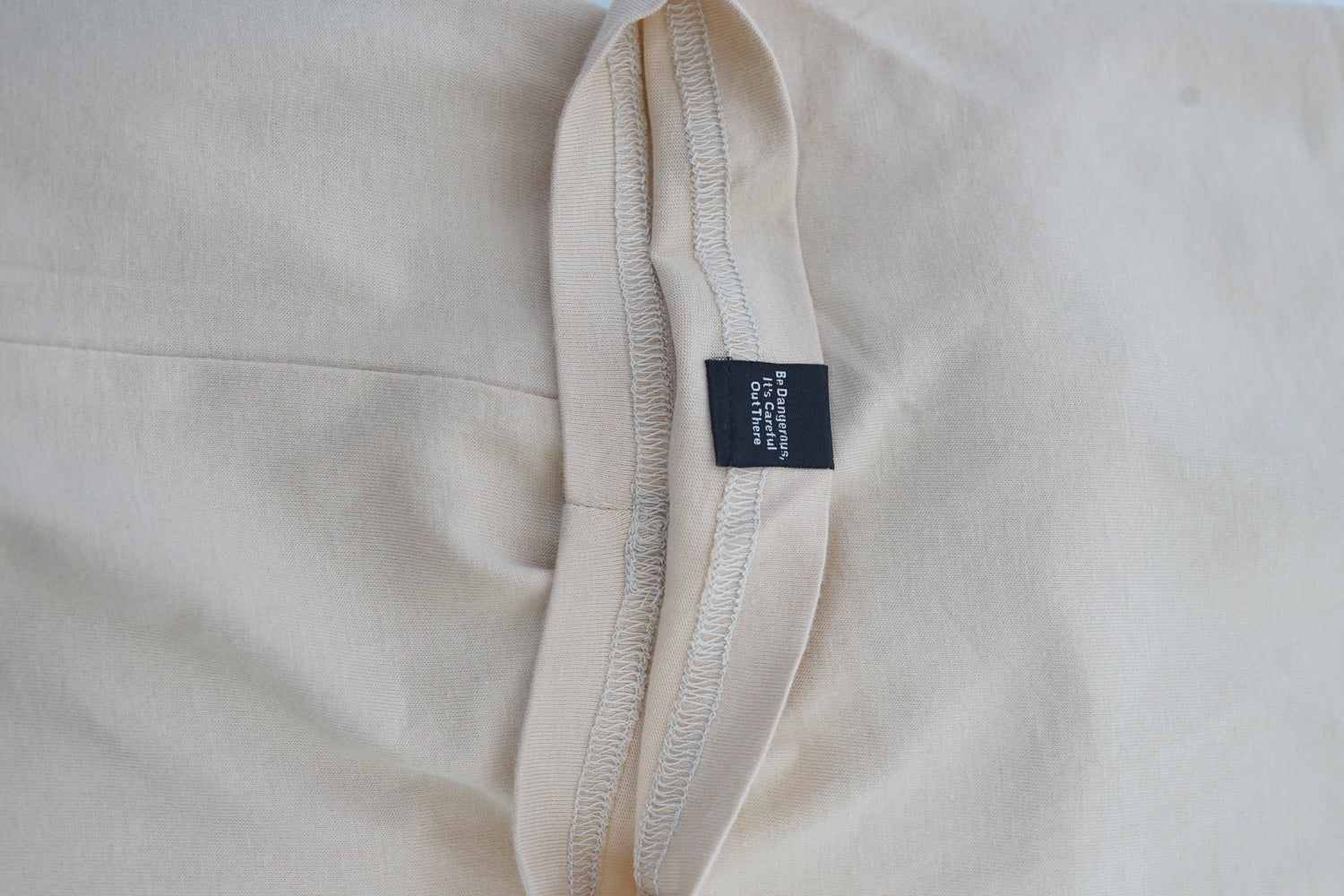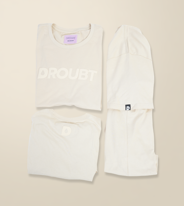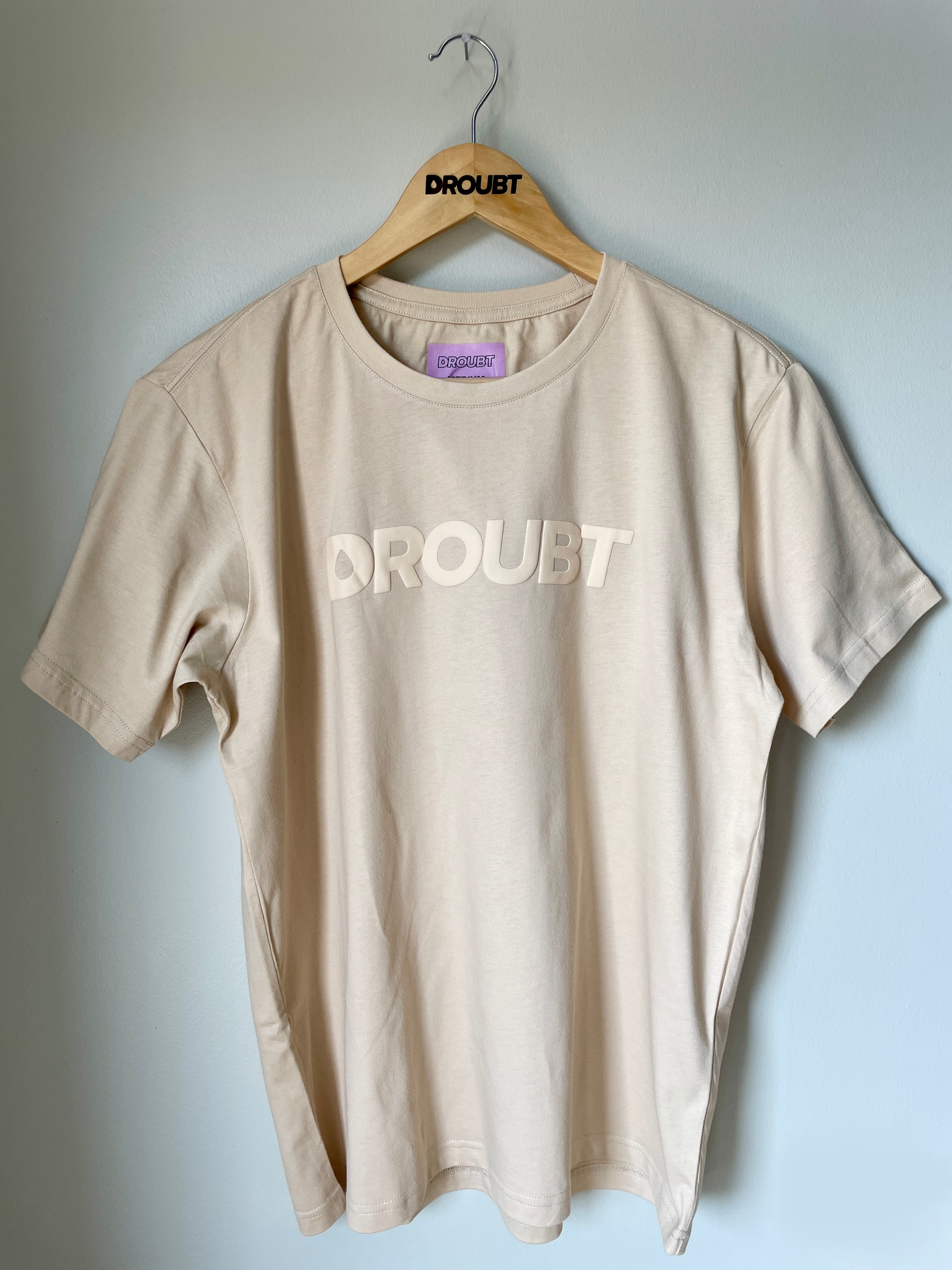 Droubt Signature Tee in Cream. Droubt Logo in puff-print center chest and between shoulders. Logo and shirt color tones match so you can wear it anytime & anywhere. Unisex. Fitted fit. Size up for a standard fit.