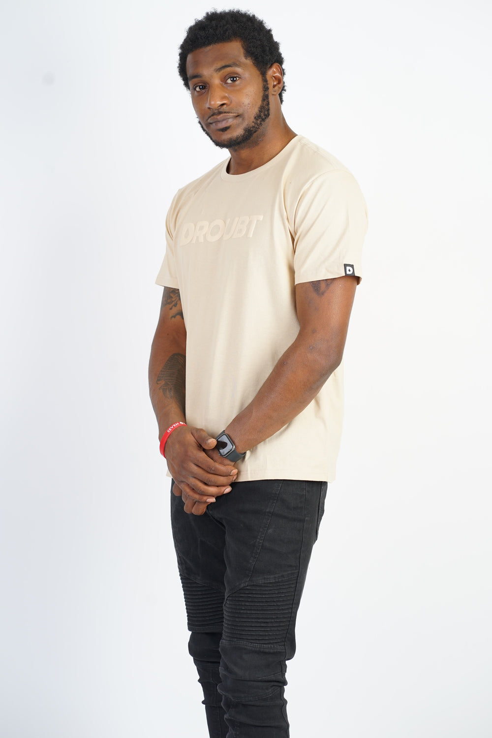 - Stitched hem tag on left sleeve featuring Droubt "D" logo with slogan on the reverse side